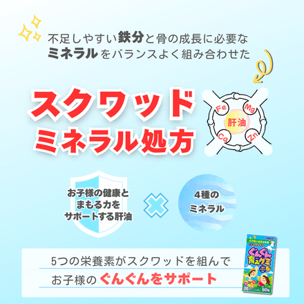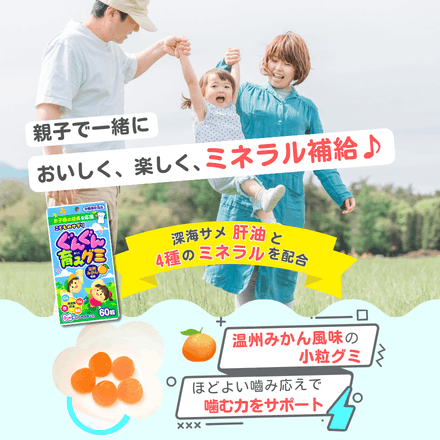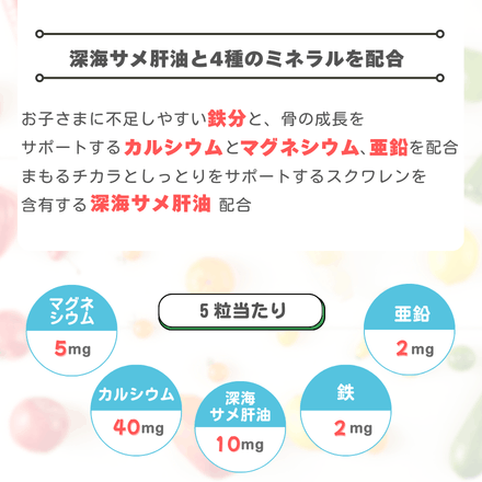 - 水飴(国内製造)、砂糖、ゼラチン、イソマルトオリゴ糖、マルトビオン酸Ca含有粉飴、温州みかん濃縮果汁、植物油脂、亜鉛含有酵母、深海さめ肝油精製油、澱粉 / ソルビトール、乳酸カルシウム、酸味料、香料、酸化マグネシウム、ピロリン酸第二鉄、パプリカ色素、光沢剤